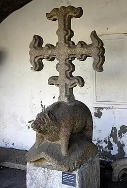 La pervivencia del románico en Galicia en períodos en los que el gótico era ya utilizado en otras zonas, conforma en Montefaro una construcción de transición desvirtuada por reformas posteriores en el siglo XVIII, y por su adaptación a usos militares. De la fábrica de 1393 sólo se conserva una magnífica portada al fondo del segundo claustro; tres vanos cubiertos por una arcada doble entrecruzada, de arquivoltas apuntadas, que se apoya sobre columnas pareadas, con capiteles de decoración zoomórfica y pasajes de la vida de San Francisco. En las basas predominan las veneras de adscripción jacobea.