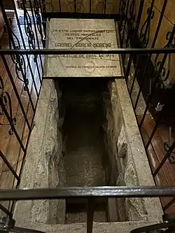 Poco después del asesinato del presidente Gabriel García Moreno, ocurrido el de 6 de agosto de 1875, su cuerpo fue ocultado para evitar su profanación. Con el paso del tiempo la ubicación de sus restos devino en un misterio y cien años después, en 1975, el arzobispo de Quito ordenó su búsqueda en los conventos y templos de la ciudad. Uno de ellos fue el Monasterio de Santa Catalina donde se hicieron varias excavaciones con el objeto de hallar su tumba hasta que en abril del mismo año,[12] la hermana Mercedes Quintana dio con sus restos al notar una lápida con las iniciales G. G. M. al fondo de una de las fosas excavadas cerca del altar de la iglesia.[13] Parte del cadáver fue trasladado a su tumba actual en la Catedral Metropolitana.