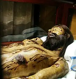 Esta venerada talla de madera de bulto yacente de 1,40 m de largo, hoy metida en una urna de cristal y situada en una capilla a la que da nombre en el lado del Evangelio (norte) a los pies del templo, junto al coro de las monjas, atesora un rico acervo de mitos y leyendas populares que durante seis siglos ha alimentado su impresionante patetismo. Sus características físicas, con miembros articulados e implantes naturales de uñas de asta de vacuno y pelo humano, y estilísticas, recreándose su anónimo autor en el rictus agónico del rostro y en la profusión de heridas, laceraciones y regueros de sangre, emparentan a este Cristo palentino, formalmente una composición artística mediocre, con otros cristos singulares de la imaginería devocional española (como el igualmente célebre Santísimo Cristo de Burgos, sito en una capilla específica en la Catedral de Burgos, tratándose en este caso de un Crucificado cubierto con faldones), todos los cuales comparten fama milagrera y un origen, según los especialistas, en la Alemania o el Flandes del siglo XIV.