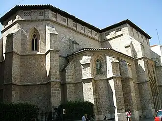 La iglesia, levantada entre los siglos XIV y XV, tiene planta de cruz griega (única en la capital) con triple cabecera absidial, siendo el ábside central de tres paños. El éxterior de los ábsides está reforzado con gruesos contrafuertes y recorrido por cornisas de cincha. En todo el perímetro superior del ábside central y la nave transversal, directamente bajo el alero del tejado, asoman ventanas de celosía de inspiración mudéjar, elemento característico en este tipo de edificios religiosos de clausura. Las bóvedas son de crucería compleja y descansan en pilares romboidales con columnillas adosadas para la descarga de las nervaduras.