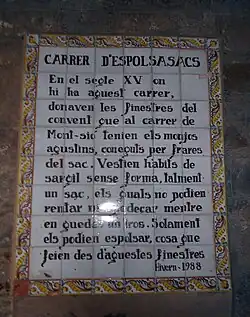 - ↑ El odónimo de la calle de Espolsa-sacs, traducible al español como "sacude-sacos", hace referencia al antiguo convento de los frailes del saco. Debido a su voto de pobreza, vestían unos hábitos de tela basta, similares a sacos, que no podían remendar ni lavar, y que únicamente podían sacudir por las ventanas de los dormitorios del convento, que daban a esta calle.
