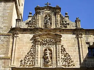 Posee dos portadas románicas en las que se exponen motivos historiados. La puerta que comunica el templo con el claustro, llamada puerta Preciosa, está decorada con imágenes del Salvador y de la Virgen María.