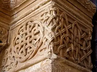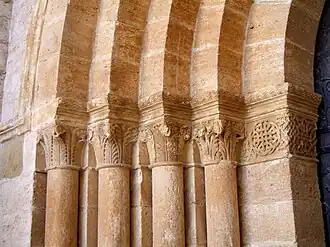 Los ábsides laterales, más simples, tienen ventanas abocinadas de medio punto. Los capiteles están ornamentados con motivos vegetales e historiados.[32]