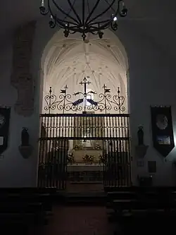 El presbiterio es posterior y tiene bóveda de crucería con nervaduras estrelladas; la reja que lo separa de la nave está fechada en 1640.
