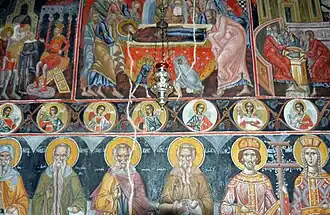 El plano de la iglesia tiene forma de tipo cruciforme y tiene una cúpula apoyada en dos columnas. La catedral principal del monasterio fue construida en el siglo XV y está decorada con frescos en 1741 realizada por dos monjes. Tiene columnas y arcos blancos, así como azulejos de color rosa. Su amplio nártex fue construido en 1689 y embellecido en 1692. La pequeña capilla de San Juan Bautista, tallado en la roca, contiene frescos del siglo XVII. En el pasado, esta estaba ricamente decorada y contenía manuscritos preciosos; sin embargo, estos tesoros fueron saqueados durante la Segunda Guerra Mundial, cuando Grecia fue ocupada por los alemanes. Se dice que los frescos del siglo XVI del edificio son pinturas postbizantinas. Un fresco con el esqueleto de Alejandro Magno adorna las paredes.