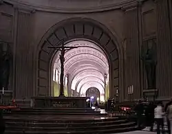 El Valle de los Caídos, denominado oficialmente Valle de Cuelgamuros desde 2022,[3] es un conjunto monumental[4] formado por una basílica católica, una abadía y una cruz de 150 m de altura asentada sobre la cumbre de un risco que domina todo el valle circundante;[5] con la peculiaridad de que la basílica es subterránea en su totalidad. Se encuentra situado en el valle de Cuelgamuros de la sierra de Guadarrama, en el municipio de San Lorenzo de El Escorial, Comunidad de Madrid, España, a 9,5 km al norte del monasterio de El Escorial y unos 50 al noroeste de Madrid.[4] Fue construido entre 1940 y 1958 principalmente con mano de obra de presos políticos republicanos,[6][7] y también trabajadores contratados.[8][9]