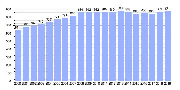 | Gráfica de evolución demográfica de Mondego entre 2000 y 2019 |
