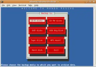 Mondo Rescue es software libre de plan de recuperación ante desastres. Soporta Linux (i386, x86-64, IA-64) y FreeBSD (i386). Es empaquetado para múltiples distribuciones (Red Hat, RHEL, Fedora, CentOS, OpenSuSE, SLES, Mandriva, Debian, Ubuntu, Gentoo).[2] También soporta cintas, discos, dispositivos USB, red y CD/DVD como medios de copias de seguridad, múltiples sistemas de archivos, LVM, software y hardware RAID. La restauración se puede realizar de unos medios físicos que incluyan soporte de cintas OBDR, o medios CD/DVD/USB, o por red a través de PXE.
