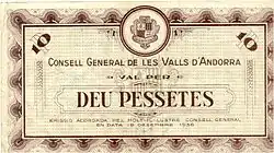 Durante la guerra civil española, debido a la escasez de moneda fraccionaria, el Consell General consideró necesario imprimir papel moneda por primera y única vez. Se trataba de billetes para la circulación interna del Principado que representaban vales por el valor de pequeñas fracciones de billetes, impresos en Toulouse, del Banco de España de veinticinco pesetas y superiores.