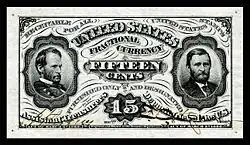 Tres personas fueron representadas en la moneda fraccionaria durante su vida: Francis E. Spinner (tesorero de los Estados Unidos), William P. Fessenden (senador de los EE. UU. y secretario del Tesoro) y Spencer M. Clark (superintendente de la Oficina Nacional de Moneda).[28] Tanto Spinner como Clark decidieron que su retrato se mostrara en la moneda, lo que generó controversia.[29] El representante republicano Martin R. Thayer de Pensilvania fue un crítico abierto, sugiriendo que se estaba abusando del privilegio del Tesoro de seleccionar retratos para la moneda.[30][31] El 7 de abril de 1866, bajo el liderazgo de Thayer,[32] el Congreso promulgó una legislación que establecía específicamente «que ningún retrato o imagen de una persona viva que sea grabado en lo sucesivo se colocará en ningún bono, valor, billete, moneda fraccionaria o postal de los Estados Unidos».[33] En la fecha de aprobación, ya se habían completado varias planchas para el nuevo billete de 15 centavos que mostraba a William Tecumseh Sherman y Ulysses S. Grant, ya que las pruebas de estas planchas existen en los archivos del Museo Nacional de Historia Estadounidense del Instituto Smithsoniano. Sin embargo, las planchas nunca se utilizaron para producir billetes en circulación. Los únicos ejemplares Sherman-Grant producidos fueron especímenes de una sola cara que se colocaron en los «escudos de moneda fraccionaria».[34]