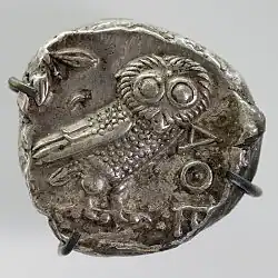 En el período arcaico, las monedas fueron verdaderamente voluminosas pero más tarde fueron normales. Eran principalmente pequeños trozos de forma de judía, de oro o de plata, estampadas con diseños geométricos o símbolos indicativos de su ciudad de origen. Las técnicas de acuñación mejoraron, las monedas más estandarizadas eran discos planos, y lo convencional era la representación del dios patrono o diosa que la ciudad hubiera establecido como emisión. Símbolos de animales como el mochuelo (muchas veces traducido como “lechuza”)[9] de Atenas llegaron a ser populares.