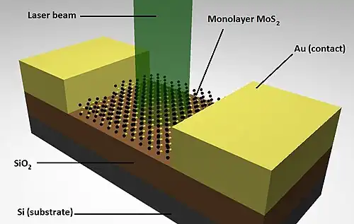 - ↑ a b Lopez-Sanchez, O.; Lembke, D.; Kayci, M.; Radenovic, A.; Kis, A. (2013). «Ultrasensitive photodetectors based on monolayer MoS2». Nature Nanotechnology 8 (7): 497-501. Bibcode:2013NatNa...8..497L. PMID 23748194. doi:10.1038/nnano.2013.100.