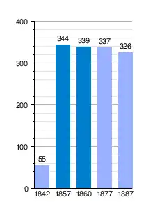 | Gráfica de evolución demográfica de Montañana[1] entre 1842 y 1887 |