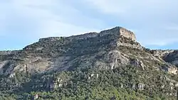 - Mola d'Estat (1120 m).[15] Es un tozal o muela en la vertiente norte del valle del río Brugent, a unos 300 m al sur de la Mola dels Quatre Termes, de 1118 m, donde se reunían los alcaldes para decidir la corta de pinos, cerca del camino viejo de Prades, que pasa al norte, a 1073 m de altitud. En la cima hay tres cruces de hierro. Al oeste, muy cerca, se halla la Cova Fumada, y al sudeste se encuentran los Roquedos de la Cansalada, que bordean los 1000 m. Desde aquí desciende el barranco del Tossal Gros, que va a desembocar en el río Brugent a la altura del Mas d'en Toni, a 650 m, donde el río gira hacia el este.
