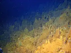 La ventilación hidrotermal se produce en el suelo meridional de la caldera de Healy[10]y produce descargas ricas en metales[45]y montículos de óxido de hierro.[46]No hay pruebas de actividad hidrotermal en el volcán Cotton[47]y, a diferencia de los demás volcanes del arco Kermadec, no se conocen comunidades animales quimiosintéticas en Healy.[48]