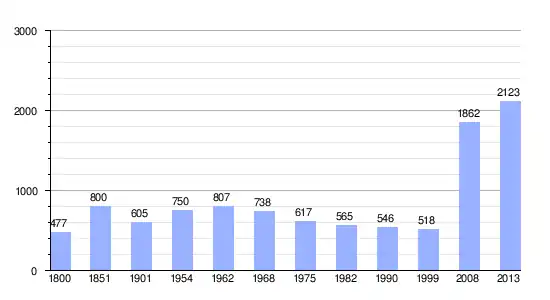 Los datos demográficos contemplados en este gráfico de la comuna de Montfaucon-Montigné[4] se han cogido de 1800 a 1999 de la página francesa EHESS/Cassini, y los demás datos de la página del INSEE.[5]