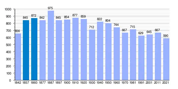 | Gráfica de evolución demográfica de Montitxelvo/Montichelvo[2] entre 1842 y 2021 |