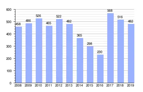 | Gráfica de evolución de la deuda viva del Ayuntamiento de la Montillana entre 2008 y 2019 |
