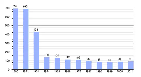 Los datos demográficos contemplados en este gráfico de la comuna de Montmorin[4] se han cogido de 1800 a 1999 de la página francesa EHESS/Cassini, y los demás datos de la página del INSEE.[5]