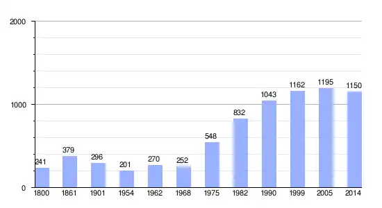 Los datos demográficos contemplados en este gráfico de la comuna de Montoy-Flanville[4] se han cogido de 1800 a 1999 de la página francesa EHESS/Cassini, y los demás datos de la página del INSEE.[5]