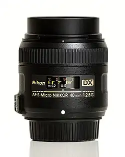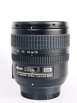 - DX — Objetivos diseñados para el formato Nikon DX, más pequeño. Puede aparecer el viñeteado si se usa en una cámara de formato de 35 mm o de formato Nikon FX en modo de cuadro completo, a pesar de que algunos modelos de objetivos DX cubren todo el cuadro 135 a distancias focales largas.