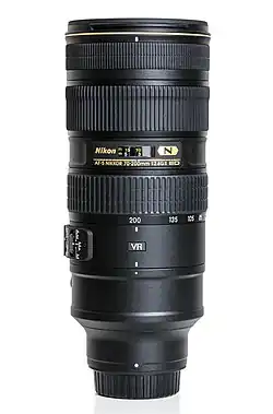 - VR — Vibration Reduction, reducción de vibraciones. Usa el movimiento de un grupo óptico para reducir el efecto del movimiento de la cámara sobre la fotografía. Algunos objetivos VR también soportan el modo barrido, detección de movimiento horizontal del objetivo y minimizan solo las vibraciones verticales. La segunda generación de VR es denominada VR II, la cual ofrece otra ventaja sobre la VR original, pero los objetivos con esta característica se siguen denominando simplemente como "VR".
