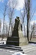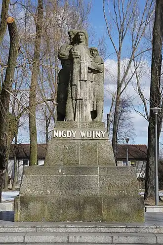 El monumento exhibe a un hombre abrazando a una mujer y a un niño. En el pie del monumento se muestra la inscripción: Guerra nunca más (polaco: NIGDY WOJNY).