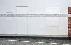 Cita del Libro de Job en la pared lateral del edificio que corta a través de los contornos de ventanas y puertas.