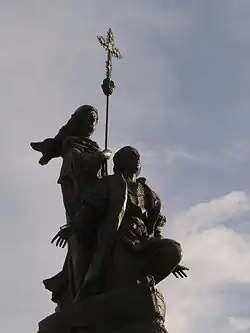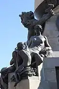 Rematando el conjunto se encuentra la figura de Colón arrodillado y, tras él, una representación alegórica de la Fe con una cruz y un cáliz.