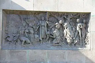 - En el último relieve se recrea el recibimiento de Colón por los Reyes Católicos.