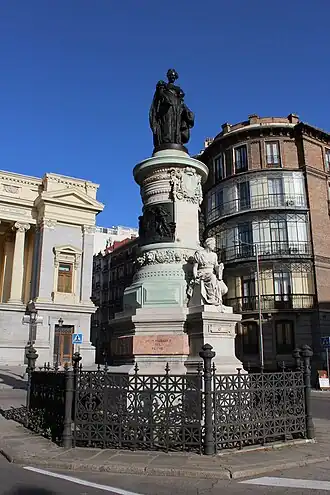 El pedestal se yergue por encima de la base;[1] de forma similar otro monumento dedicado a una mujer como el de Bárbara de Braganza, diseñado también por Benlliure, presenta un contorno cilíndrico sin aristas.[2] La parte más baja del pedestal presenta un friso circular con cabezas de león y guirnaldas.[1]
