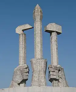 Los tres elementos más altos del monumento presentan tres puños cerrados que sostienen un martillo, una hoz y un pincel de tinta.[2] La hoz y el martillo simbolizan a los trabajadores y campesinos y el pincel a los intelectuales .[15] Este alegoría encuentra su base en el emblema del Partido del Trabajo de Corea.[16] El monumento tiene una altura de 50 metros como homenaje del 50.º aniversario del partido.[17]