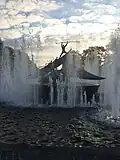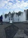 Presenta un barco de pesca levantado por la aleta de una ballena. Representa cuatro figuras de balleneros con remos en un bote abierto, con arpones listos y rociando agua. Está hecho al estilo de una rosa de los vientos y gira lentamente. Las partes centrales están hechas de bronce y pesan 26 toneladas. Las columnas de agua en la fuente son reguladas a diferentes alturas. La piscina tiene 128 luces submarinas. Alrededor de la fuente hay relieves estilizados en granito de la caza de ballenas moderna.[7][8][9]