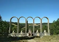 El monumento se extiende a lo largo de la ladera del cerro donde impacto el avión que transportaba a Mola, ocupa gran parte del cerro, y se sitúa a unos 300 metros desde el pie de la montaña. Los lugares donde los cuerpos fueron hallados se señalan con una cruz de piedra. A esta zona se le denomina recinto sagrado. Por su parte superior se encuentra la quíntuple arquería donde cada uno de los arcos está dedicado a una de las víctimas, el central al General Mola. Bajo ese arco, por la parte de arriba, hay un altar muy dañado. Subiendo un extenso graderío se llega a lo alto del monumento en el que hay una torre, con planta de cruz griega, de unos 20 m de altura con mirador y en grandes letras de bronce "MOLA".[3]