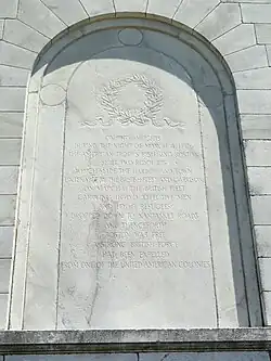 ON THESE HEIGHTS / DURING THE NIGHT OF MARCH 4 1776 / THE AMERICAN TROOPS BESIEGING BOSTON / BUILT TWO REDOUBTS / WHICH MADE THE HARBOR AND TOWN / UNTENABLE BY THE BRITISH FLEET AND GARRISON / ON MARCH 17 THE BRITISH FLEET / CARRYING 11000 EFFECTIVE MEN / AND 1000 REFUGEES / DROPPED DOWN TO NANTASKET ROADS / AND THENCEFORTH / BOSTON WAS FREE / A STRONG BRITISH FORCE / HAD BEEN EXPELLED / FROM ONE OF THE UNITED AMERICAN COLONIES[16]
