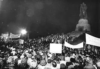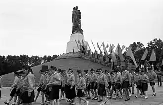 En la inauguración del monumento conmemorativo soviético en el Parque de Treptow, el 8 de mayo de 1949, cuarto aniversario del final de la guerra, Otto Grotewohl, uno de los copresidentes del SED y más tarde primer ministro, fundador ese mismo año la República Democrática Alemana, dedicó el monumento en agradecimiento a los soldados soviéticos que entregaron sus vidas.[9] Como jefe de la delegación alemana terminó su discurso con estas palabras: