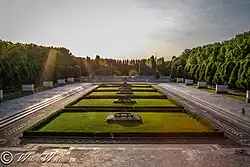 Un ancho y ligeramente creciente bulevar, bordeado por sauces a lo largo del camino central, lleva al eje principal de la instalación. Está marcado por dos grandes banderas estilizadas de granito rojo, inclinadas a ambos lados del camino. El mármol utilizado en su construcción fue extraído de la demolida Cancillería del Reich de Adolf Hitler. Al tope de estas dos estructuras se observa una escultura de bronce de un soldado arrodillado con uniforme, armado con una metralleta y con su casco en la mano. El soldado del lado derecho es un poco más joven que el del lado izquierdo. De aquí a pocos pasos se llega hasta el cementerio simbólico, que es el centro de la planta. Comienza con césped y pequeños arbustos plantados por las tumbas; son cinco bloques cuadrados, cada uno con una corona de laureles de bronce (la tumba real se encuentra, sin embargo, a los lados de los bloques, bajo los árboles y bajo el montículo).