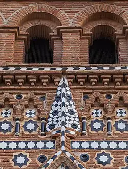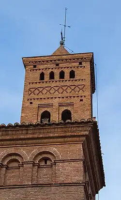 Exteriormente destaca su monumental fachada, donde la portada gótica aparece enmarcada por un gran alfiz cuyas enjutas se decoran con diversos motivos realizados en cerámica vidriada como estrellas, cruces y discos. Este tipo de decoración distribuida en dos registros enmarcados por fajas de esquinillas se extiende por toda la fachada e incluso bajo la galería de arquillos, donde se combina con otros motivos realizados en ladrillo resaltado como arcos mixtilíneos. Esta fachada, construida a principios del siglo XV como la mayor parte de la iglesia, es uno de los ejemplos más ricos y mejor conservados de decoración mudéjar.