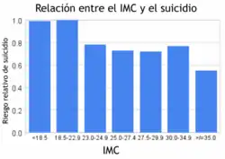 - ↑ a b Mukamal KJ, Rimm EB, Kawachi I, O'Reilly EJ, Calle EE, Miller M (November 2009). «Body Mass Index and Risk of Suicide Among One Million US Adults». Epidemiology 21 (1): 82-6. PMID 19907331. doi:10.1097/EDE.0b013e3181c1fa2d.