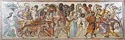 La escena representa al dios griego Dioniso, hijo de Zeus romanizado como Baco y su compañera Ariadna, en su marcha triunfal sobre un carro tirado por tigres, aunque se representan otros animales alrededor como leones, jirafas y elefantes, rodeado de su frenético cortejo habitual de Ménades, Sátiros y Silenos. Entre sus atributos habituales, está su bastón en la mano derecha, su chaleco de piel de pantera, la corona de hojas de vid o hiedra[1] y un manto que le cubre los hombros.
