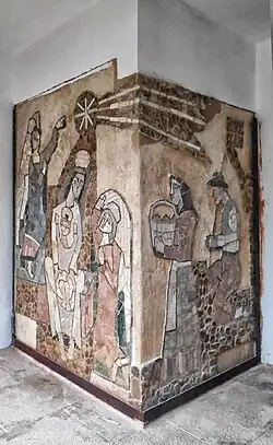 La Natividad de Jesús se muestra bajo la estrella y entre ángeles, acercándose desde el lateral campesinos con ofrendas e instrumentos, quizá los más logrados del conjunto. Los contornos y algunas subdivisiones internas se delimitan mediante líneas negras y todo se resuelve con una factura muy ingenuista. La otra escena recoge el Pentecostés, con un apostolado que recibe la llegada del Espíritu Santo en una composición abigarrada y algo confusa, si bien rica en soluciones plásticas y texturas.[14]