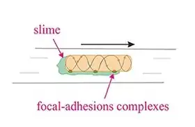 La motilidad por deslizamiento es un tipo de translocación independiente de estructuras propulsoras como los flagelos o los pili.[42] El deslizamiento permite a los microorganismos desplazarse por la superficie de películas acuosas bajas. Los mecanismos de esta motilidad sólo se conocen parcialmente. La motilidad de deslizamiento utiliza un conjunto muy diverso de complejos motores diferentes, incluidos, por ejemplo, los complejos de adhesión focal de Myxococcus.[43][44] La velocidad de deslizamiento varía entre organismos, y la inversión de dirección parece estar regulada por algún tipo de reloj interno.[45]