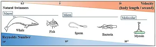 Aquí, ρ representa la densidad del fluido; u es una velocidad característica del sistema (por ejemplo, la velocidad de una partícula nadadora); l es una escala de longitud característica (por ejemplo, el tamaño del nadador); y μ es la viscosidad del fluido. Si se considera que el fluido en suspensión es agua y se utilizan los valores de u observados experimentalmente, se puede determinar que la inercia es importante para los nadadores macroscópicos, como los peces (Re = 100), mientras que la viscosidad domina el movimiento de los nadadores a microescala, como las bacterias (Re = 10-4).[3]
