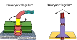 Algunas células eucariotas también utilizan flagelos, que pueden encontrarse en algunas protistas y plantas, así como en células animales. Los flagelos eucariotas son proyecciones celulares complejas que se mueven hacia delante y hacia atrás, en lugar de circularmente. Los flagelos procariotas utilizan un motor rotatorio y los eucariotas un complejo sistema de filamentos deslizantes. Los flagelos eucariotas son impulsados por ATP, mientras que los procariotas pueden ser impulsados por ATP (arqueas) o por protones (bacterias).[22]
