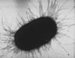 Los pili pueden utilizarse para retorcerse. Son filamentos largos y pegajosos, como se muestra aquí cubriendo esta bacteria E. coli.[36]