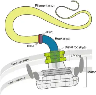 El flagelo bacteriano es una proteína-nanomáquina que convierte la energía electroquímica en forma de gradiente de iones H+ o Na+ en trabajo mecánico.[26][27][28] El flagelo se compone de tres partes: el cuerpo basal, el gancho y el filamento. El cuerpo basal es un motor reversible que atraviesa la envoltura celular bacteriana. Está compuesto por la varilla central y varios anillos: en las bacterias Gram negativas, son el anillo L externo (lipopolisacárido) y el anillo P (peptidoglicano), y el anillo MS interno (membrana/supramembrana) y el anillo C (citoplasmático).[29] Las proteínas Mot (MotA y MotB) rodean los anillos internos en la membrana citoplasmática; la translocación de iones a través de las proteínas Mot proporciona la energía para la rotación de los flagelos.[26] Las proteínas Fli permiten la inversión de la dirección de rotación de los flagelos en respuesta a estímulos específicos.[30][31] El gancho conecta el filamento a la proteína motora en la base. El filamento helicoidal está compuesto por muchas copias de la proteína flagelina, y puede girar en el sentido de las agujas del reloj (CW) y en sentido contrario (CCW).[3][32][33][34][35]