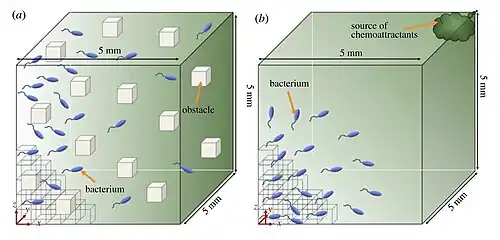 Para estudiar el efecto de los obstáculos (otra condición ambiental) en el movimiento de las bacterias, Chepizhko y sus colaboradores estudian el movimiento de partículas autopropulsadas en un entorno bidimensional heterogéneo y demuestran que el desplazamiento cuadrático medio de las partículas depende de la densidad de obstáculos y de la velocidad de giro de las partículas.[152][153] A partir de estos modelos, Cates destaca que la dinámica bacteriana no siempre obedece al equilibrio detallado, lo que significa que es un proceso de difusión sesgado que depende de las condiciones ambientales.[154] Además, Ariel y sus colaboradores se centran en la difusión de las bacterias y demuestran que éstas realizan una superdifusión durante el enjambre sobre una superficie.[135][155]