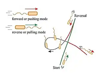 Además de estas inversiones de 180°, las células pueden reorientarse (un «flick») en un ángulo de unos 90°, lo que se conoce como giro por pandeo.[53][57] Rhodobacter sphaeroides, con su flagelación subpolar monótona, representa otra estrategia de motilidad:[24][54] el flagelo sólo gira en una dirección, y se detiene y se enrolla contra el cuerpo celular de vez en cuando, lo que provoca reorientaciones del cuerpo celular.[55][58][59] En la bacteria del suelo Pseudomonas putida, un penacho de flagelos helicoidales está unido a su polo posterior. P. putida alterna entre tres modos de natación: empujar, tirar y envolver.[3][56]