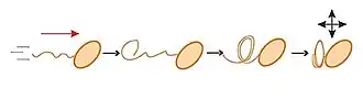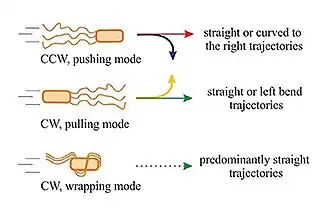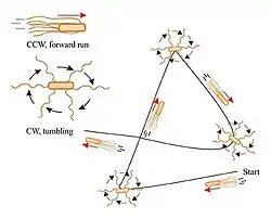Muchas bacterias nadan impulsadas por la rotación de los flagelos fuera del cuerpo celular. A diferencia de los flagelos de los protistas, los flagelos bacterianos son rotores e, independientemente de la especie y del tipo de flagelación, sólo tienen dos modos de funcionamiento: rotación en el sentido de las agujas del reloj (CW) o en sentido contrario (CCW). La natación bacteriana se utiliza en la taxia bacteriana (mediada por receptores específicos y vías de transducción de señales) para que la bacteria se desplace de forma dirigida a lo largo de gradientes y alcance condiciones más favorables para la vida.[50][51] La dirección de la rotación flagelar está controlada por el tipo de moléculas detectadas por los receptores de la superficie de la célula: en presencia de un gradiente atrayente, aumenta la velocidad de natación suave, mientras que la presencia de un gradiente repelente aumenta la velocidad de volteo.[3][52]El arquetipo de la natación bacteriana está representado por el organismo modelo Escherichia coli, muy estudiado.[3] Con su flagelación peritricosa, E. coli realiza un patrón de natación de correr y tropezar, como se muestra en el diagrama de la derecha. La rotación en sentido contrario a las agujas del reloj de los motores flagelares da lugar a la formación de un haz flagelar que empuja a la célula hacia delante, paralelamente al eje longitudinal de la célula. La rotación en sentido horario desarma el haz y la célula gira al azar (tumbling). Tras el tumbling, la célula recupera el movimiento rectilíneo en una nueva dirección.[52] Es decir, la rotación CCW da lugar a un movimiento estable y la rotación CW al tumbling; la rotación CCW en una dirección determinada se mantiene durante más tiempo en presencia de moléculas de interés (como azúcares o aminoácidos).[3][52]
