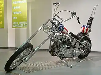 - Chopper: se las llama así por el verbo inglés "to chop" (cortar), ya que se corta o desmonta de la moto todo lo que resulta superfluo. Aparecen a finales de los años 60 en Estados Unidos y se caracterizan por ser motocicletas delgadas, bajas por la parte de atrás y altas por la parte delantera, con horquillas muy largas (a veces exageradamente), la rueda del tren delantero delgada y la rueda trasera mucho más gruesa. En este caso sí se modifica el chasis e incluso en algunos casos se instala un chasis creado especialmente para convertir la moto en una chopper. Los manillares originales suelen sustituirse por "ape hangers" (cuelgamonos), llamados así porque dada su altura obligan a mantener los brazos en alto y dan la impresión de que el piloto va colgado de ellos, aunque también pueden verse choppers con manillares rectos y bajos, en los casos en los que el propio chasis deja las torres que sujetan el manillar a una altura equiparable a la de un cuelgamonos. Así, en la actualidad existen matices sobre todo con el tipo de manillar y el ángulo de lanzamiento de la horquilla, pero básicamente es muy fácil reconocer una chopper por varios factores principales (aunque hay matices): Chasis estrechos y largos, mucho más altos por delante que por detrás, depósitos de combustible relativamente pequeños con respecto a una moto de origen, suspensiones traseras rebajadas o incluso inexistentes (chasis rígido), horquillas largas y muchas veces con suspensiones de muelles (Springer). La pintura suele ser colorista y llamativa, abundan los cromados y los brillos. La aerografía está muy presente a lo largo de toda la moto.